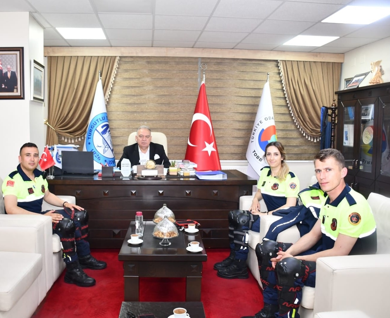 Turgutlu İlçe Jandarma Komutanlığı Trafik Şube Tim Komutanı Zeynep Özge Erkan ile Mustafa Mukan ve Kemal Hatip Erel, Turgutlu Ticaret ve Sanayi Odası (TUTSO) Yönetim Kurulu Başkanı Faruk Aydın'ı ziyaret etti.