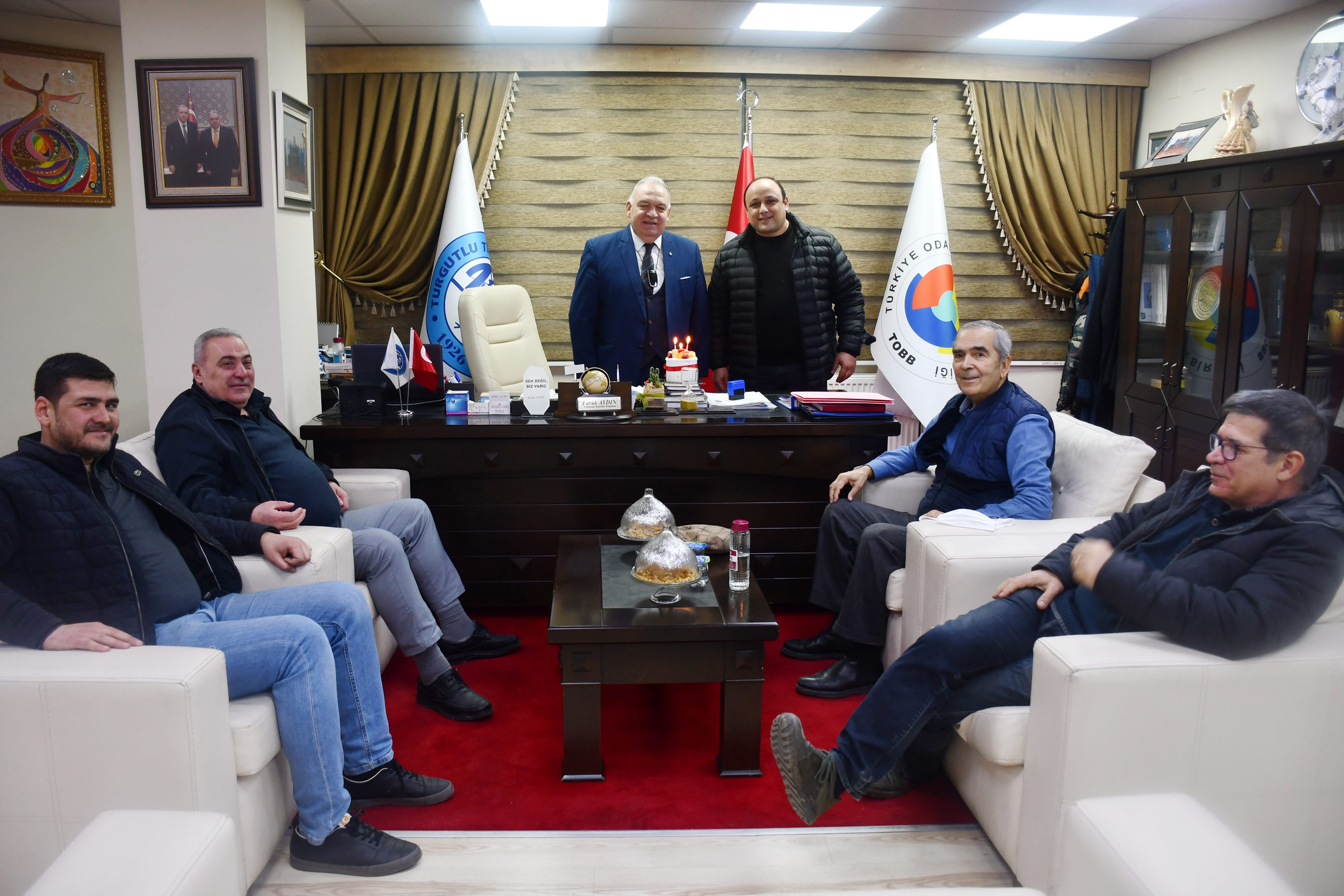 Turgutlu Ticaret ve Sanayi Odası yönetim kurulunun haftalık olağan toplantısı öncesinde, Yönetim Kurulu Başkanı Faruk Aydın, doğum günü olan muhasip üye M. Fatih Akkaynak'a pasta keserek sürpriz yaptı.