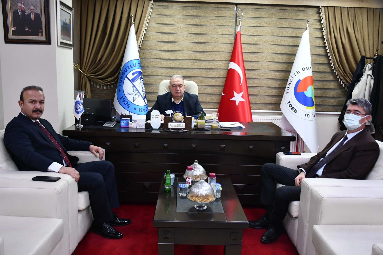 Turgutlu İlçe Emniyet Müdürü Harun Tutak ile Turgutlu İlçe Sağlık Müdürü Dr. Bilgehan Hasyiğit, Turgutlu Ticaret ve Sanayi Odası (TUTSO) Yönetim Kurulu Başkanı Faruk Aydın'ı ziyaret ettiler.