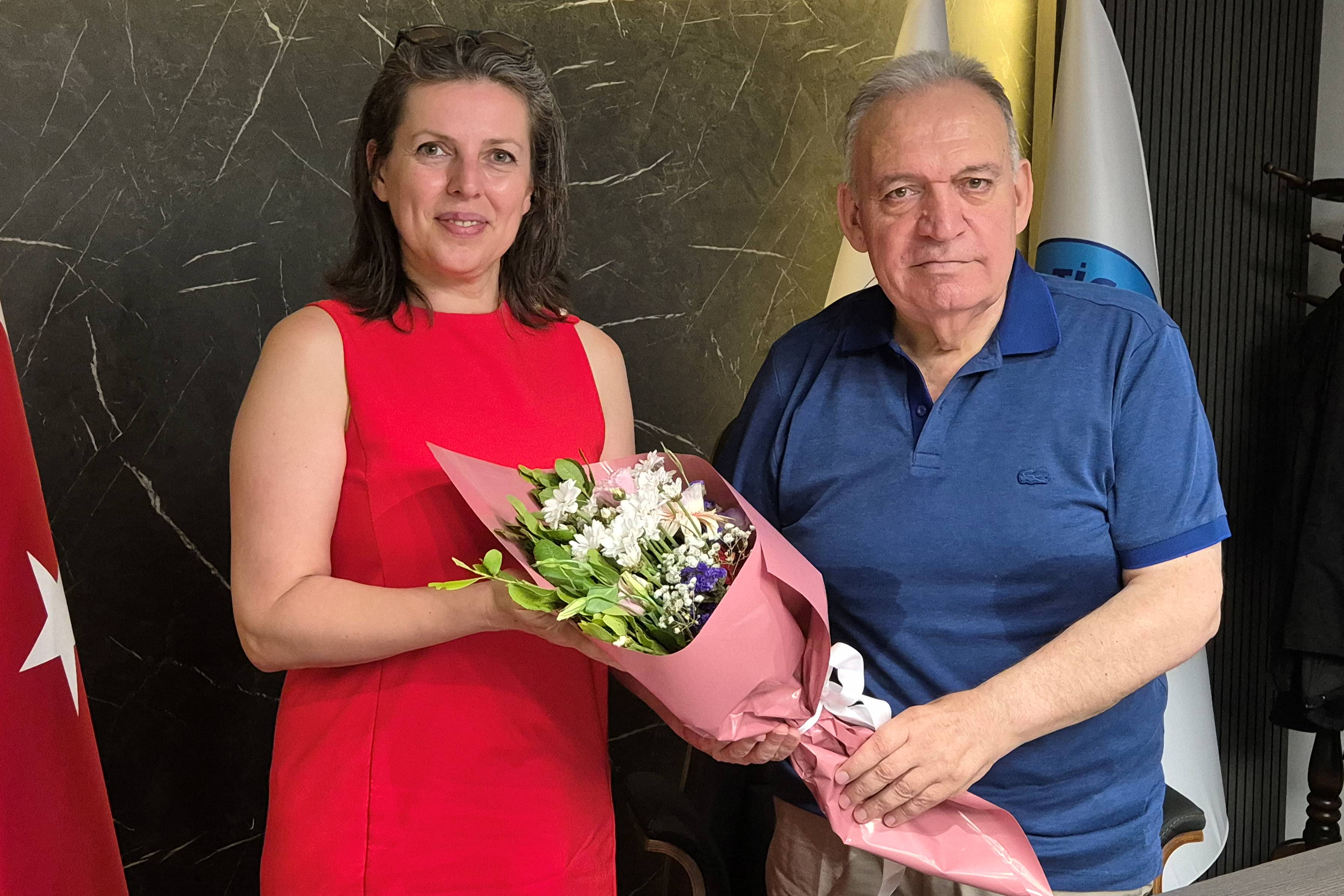 Başkan Aydın, TUTSO Yönetim Kurulu toplantısına katılarak çalışmalar hakkında kendilerini bilgilendiren TOBB Turgutlu Anaokulu Müdürü Nurcan Yılmaz'a çalışmalarından dolayı teşekkür ederek, çiçek takdim etti.