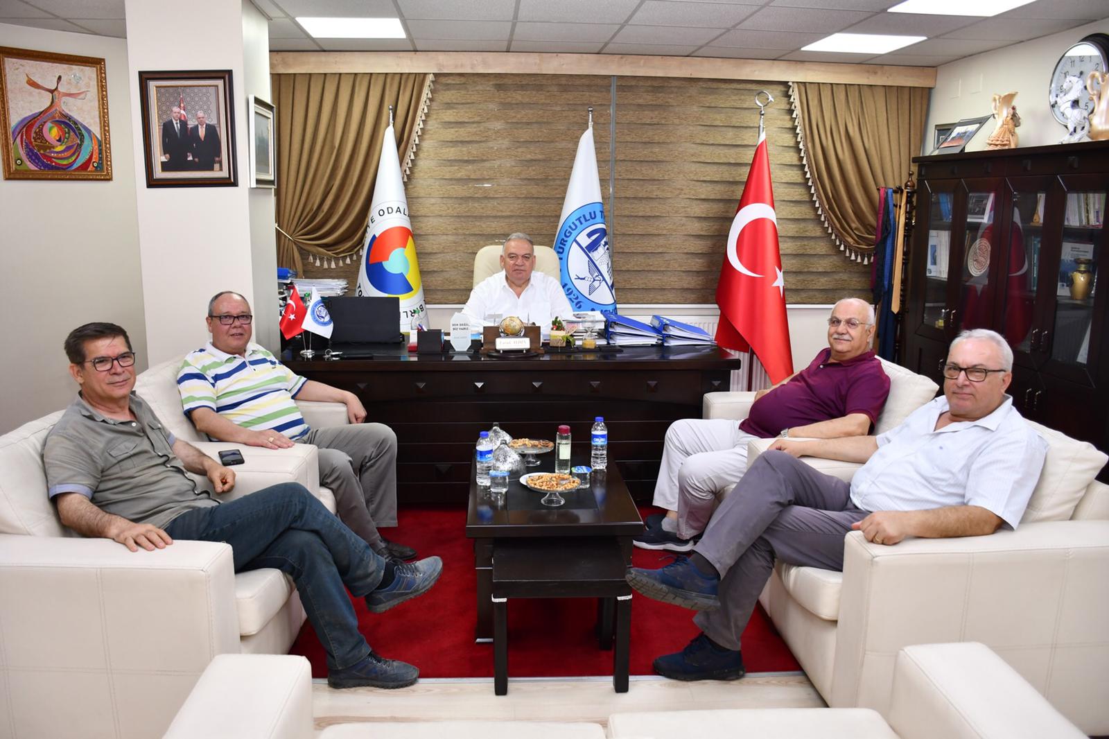 Turgutlulu iş insanları, Nüvit Vardarlı ve Hasan Çizmeci ile TUTSO Yönetim Kurulu Üyesi Haldun Tüzün ve Meclis Üyesi Mustafa Edip Artun, Turgutlu Ticaret ve Sanayi Odası (TUTSO) Yönetim Kurulu Başkanı Faruk Aydın'ı ziyaret etti.