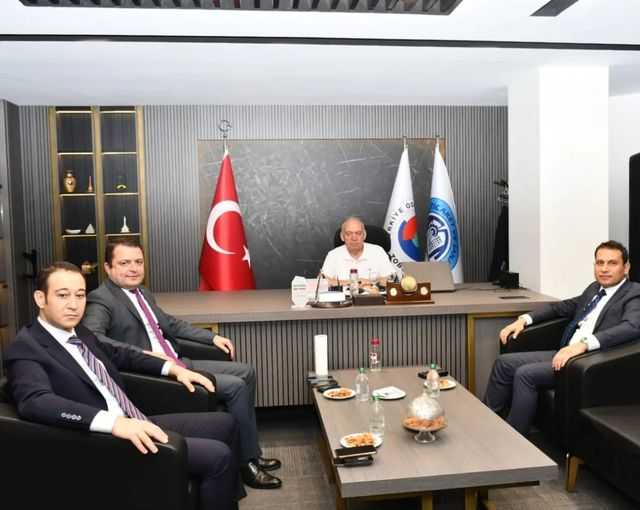 Halkbank İzmir Bölge Müdürü Ömür Batur, Bölüm müdürü Hasan Pekkıyak ve Şube Müdürü Yavuz Gürcan, TUTSO Yönetim Kurulu Başkanı Faruk Aydın'ı ziyaret etti.