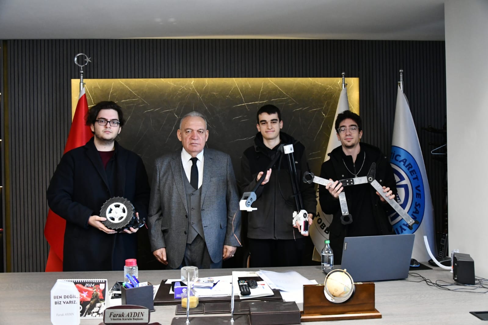 Hasan Ferdi Turgutlu Teknoloji Fakültesi Uarkek Rover Team takımı Sorumlusu Turab Biçer, Takım Üyeleri Taha Eren Karabaş ve Emre İper, Turgutlu Ticaret ve Sanayi Odası (TUTSO) Yönetim Kurulu Başkanı Faruk Aydın'ı ziyaret etti.