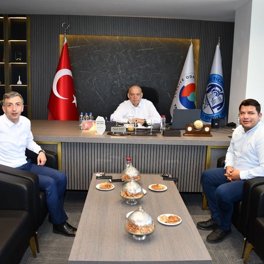 Şekerbank Turgutlu Şube Müdürü Oktay Turan ile Yönetmen Cihan Taçyıldız, Turgutlu Ticaret ve Sanayi Odası (TUTSO) Yönetim Kurulu Başkanı Faruk Aydın'ı ziyaret etti.