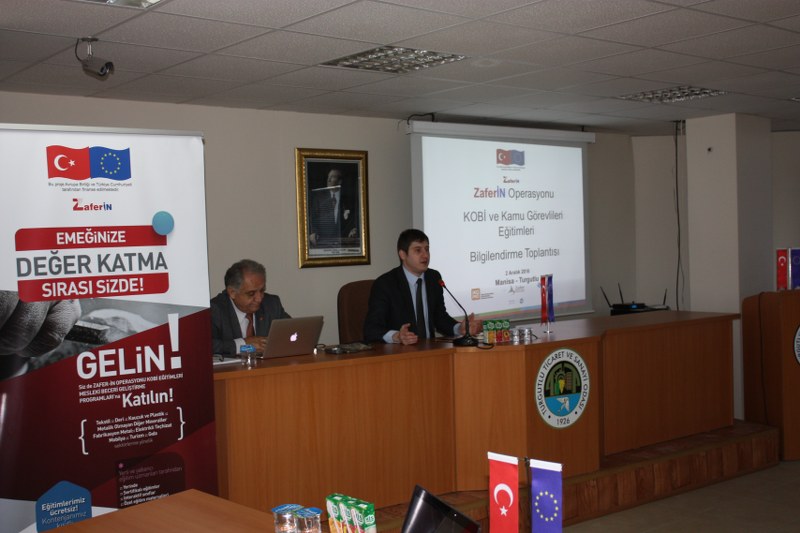 02.12.2016 - Zafer Kalkınma Ajansı’nın Operasyon Faydalanıcısı ve Çalışma ve Sosyal Güvenlik Bakanlığı Avrupa Birliği ve Mali Yardımlar Dairesi Başkanlığı’nın Sözleşme Makamı olduğu Zafer-İn Operasyonu (TR33 Bölgesi’ndeki İşveren ve İşçilerin Uyum Yeteneğinin Arttırılması Teknik Destek Projesi) kapsamında 02.12.2016 günü Bölgesel Kalkınma Uzmanı Ethem Erkal Keçe, Operasyon Koordinatörü İskender Cem Leblebici ve çok değerli Ajans Uzmanları tarafından, Odamız üyelerine program kapsamında verilecek eğitim ve hizmetler hakkında bilgiler aktarıldı.